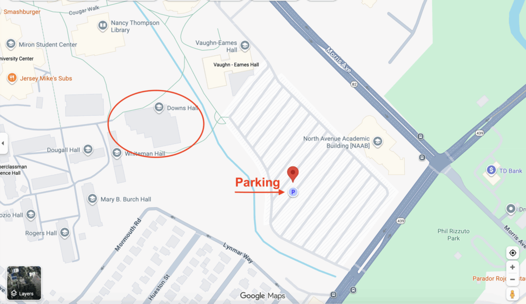 Enter Kean through the main entrance on Morris Avenue and enter the parking lot next to Vaughn-Eames Hall/Bauer Boucher Theatre Center. Follow the lawn signs to Downs Hall.